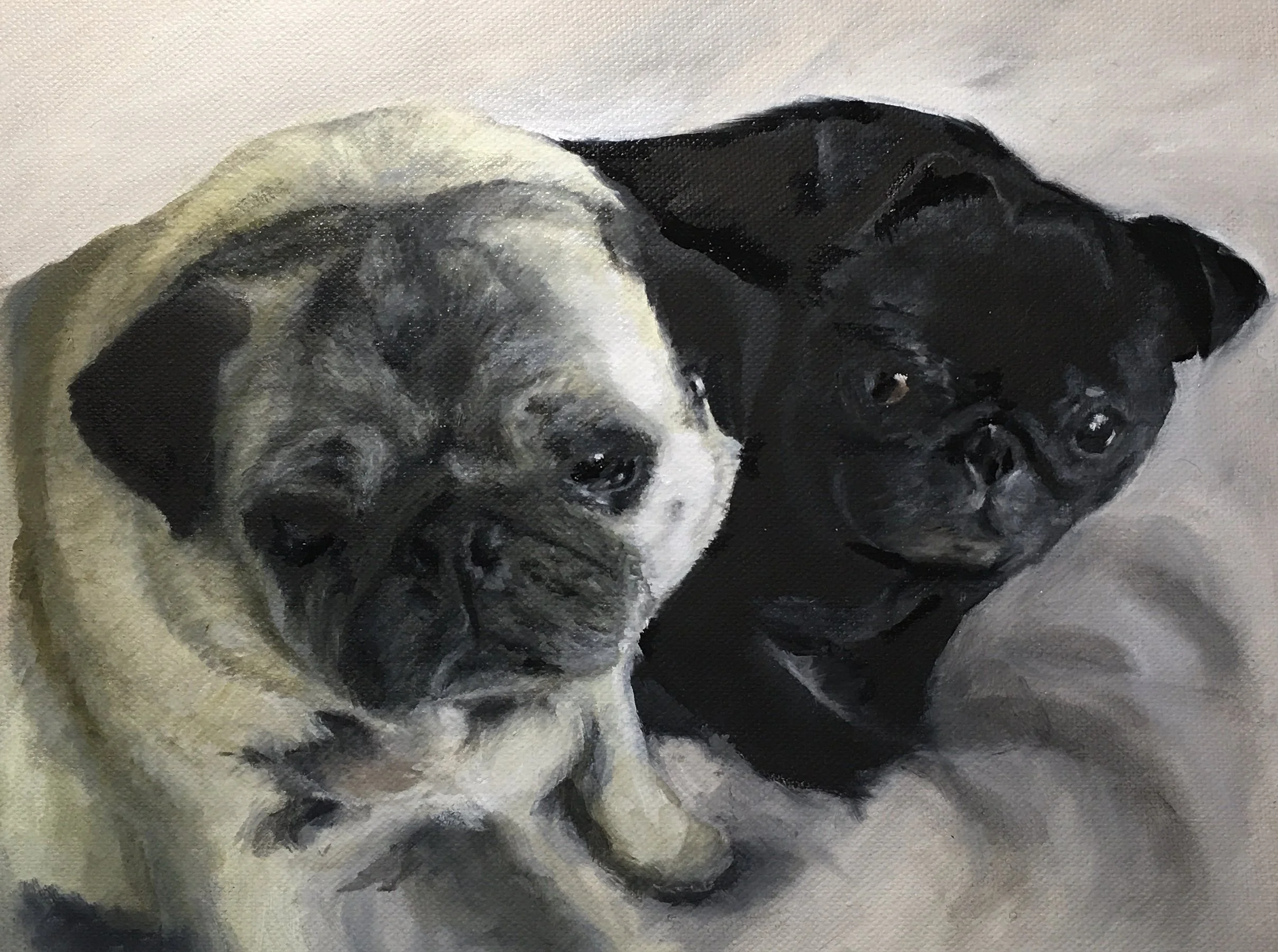 Tim is an empathetic painter with an extraordinary sense of whom he is creating a painting of! Tim never met my pugs, I simply provided a grainy photograph of them and he has captured the characters of my pug dogs in a masterful oil painting sensitive & cheeky dudes! I will treasure this to keep forever Tim has an immense talent and I’m thrilled he is using it to create wonderful art and makes a lot of people very happy. Sadly we lost our black pug earlier this year, which makes having them depicted in oil together even more cherished.